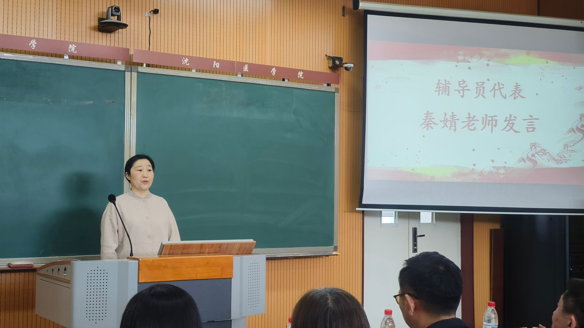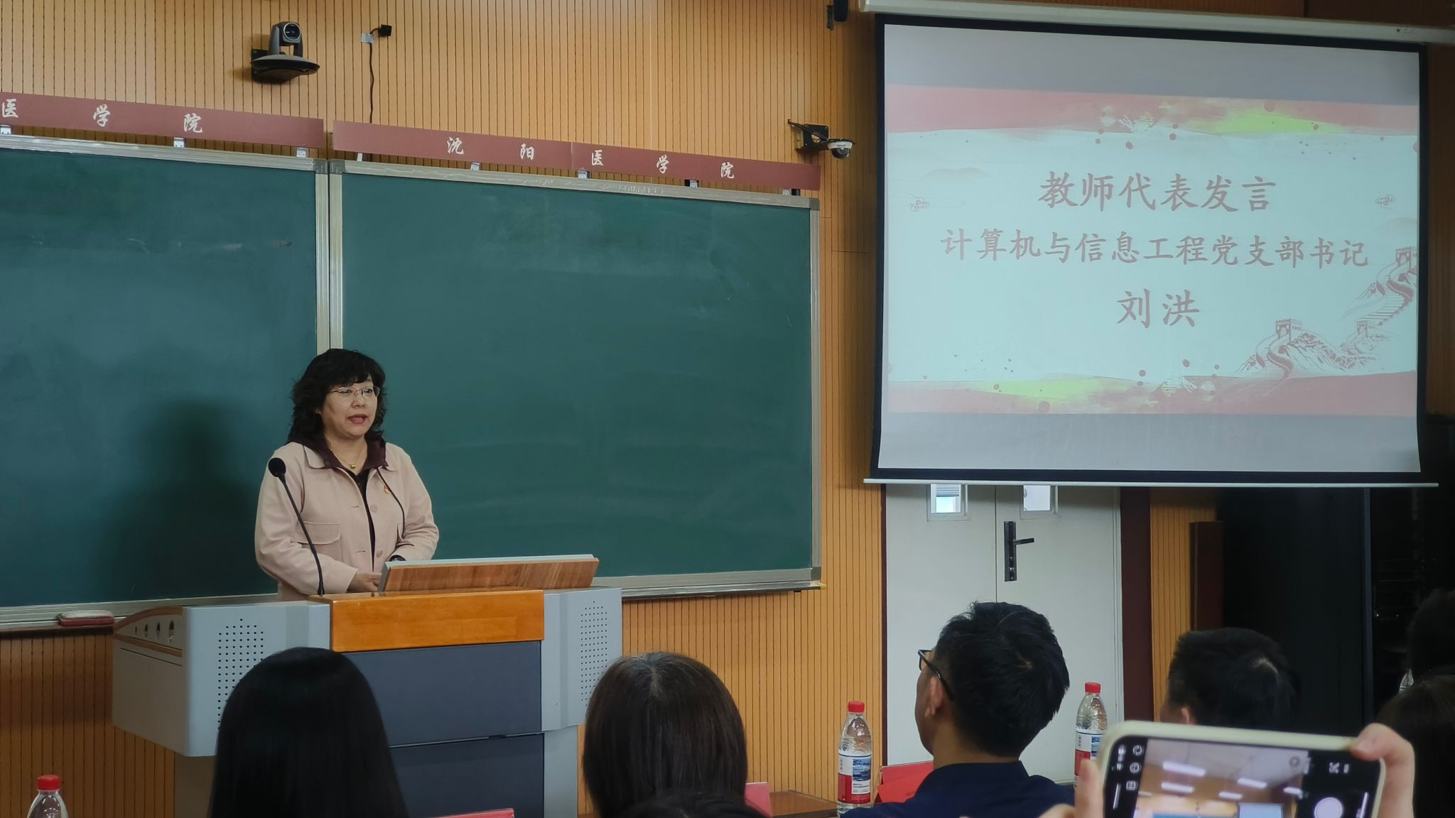 在教师代表发言环节,辅导员秦婧系统梳理了过去一年学院思政教育工作情况,并提出未来将进一步推动思政教育与学生学业、日常生活的深度融合;计算机与信息工程党支部书记刘洪从党建引领的角度,全面总结了“明德思政课堂”的实践成果,并表示未来将深化“双带头人”机制,着力打造“专业 + 思政”协同育人的创新范式。