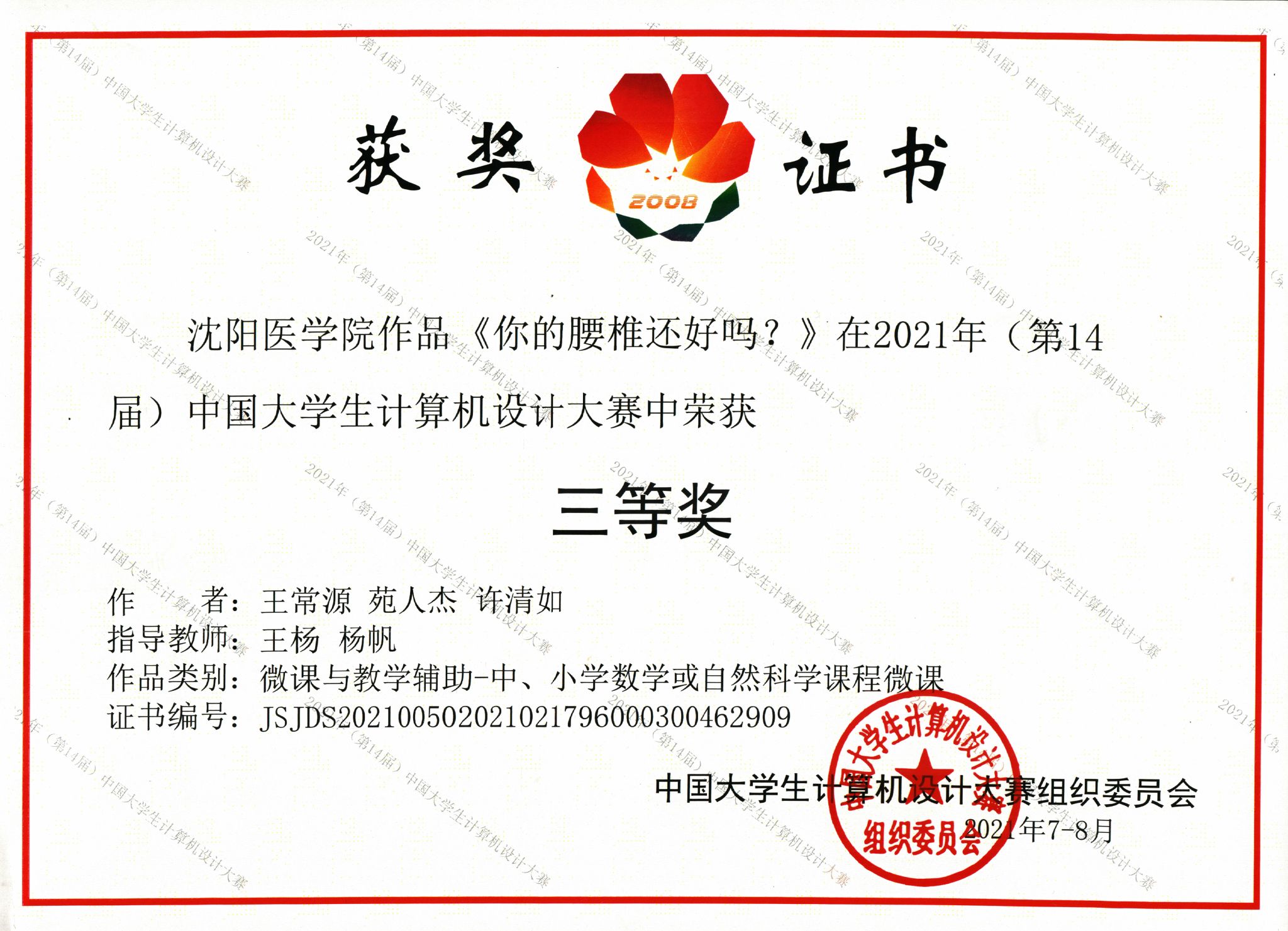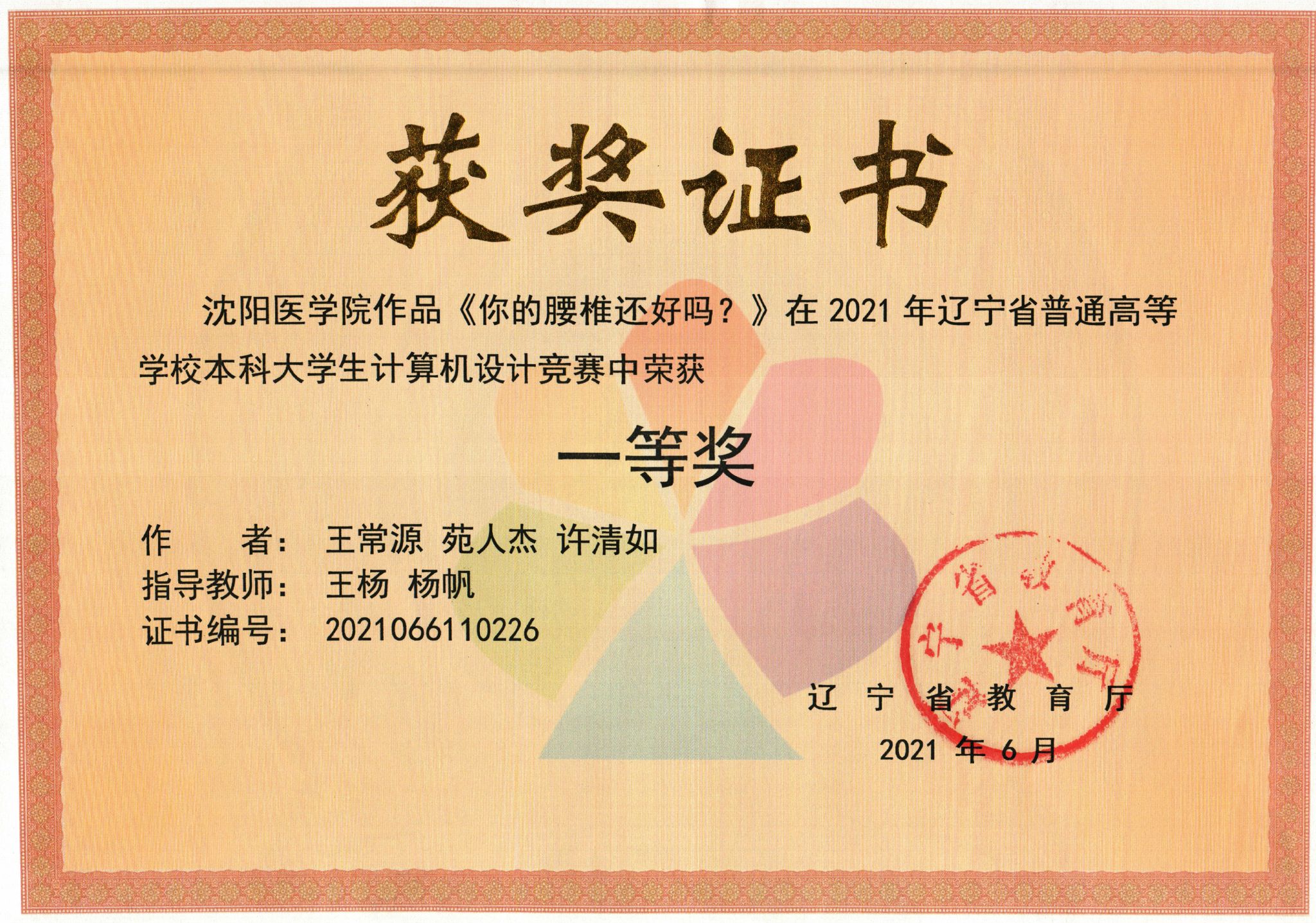 学生团队众志成城、通力协作,在激烈的竞争中秉持积极向上的精神,以技艺高超的表现,以《你的腰椎还好吗?》科普视频荣获辽宁省大学生计算机设计大赛一等奖、中国大学生计算机设计大赛三等奖!彰显我校在科普领域有知识储备能力高和极高的实践能力。